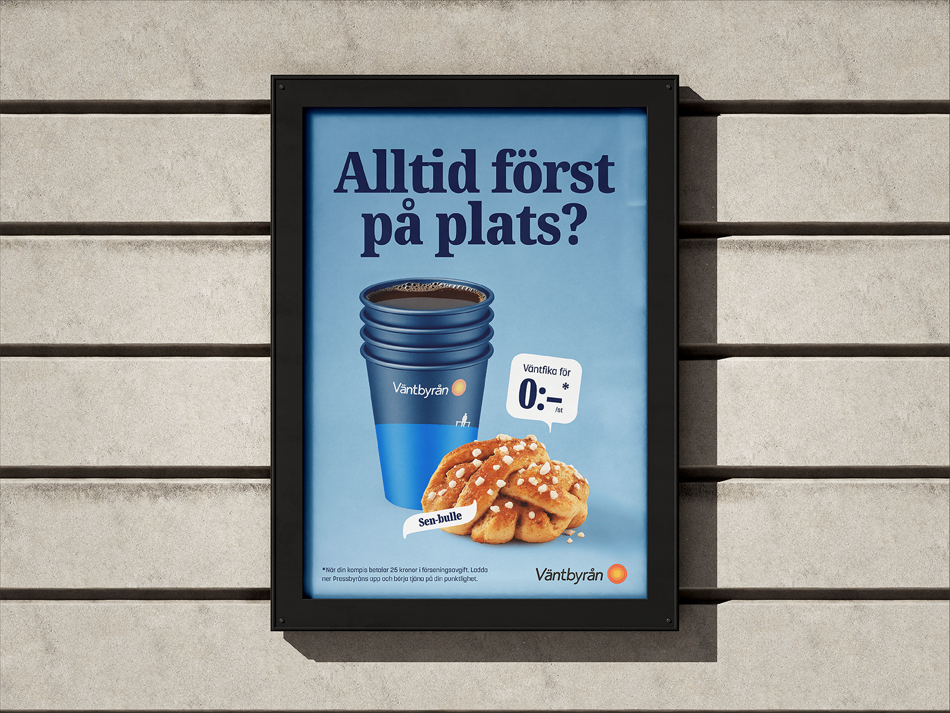 Genom kampanjen Väntbyrån hjälper Pressbyrån dig tjäna på din väntan. I appen kan personer som kommit i tid be om kompensation från sina sena kompisar. Genom att värdera din tid stärker Pressbyrån också sin ställning som hela Sveriges självklara väntplats.